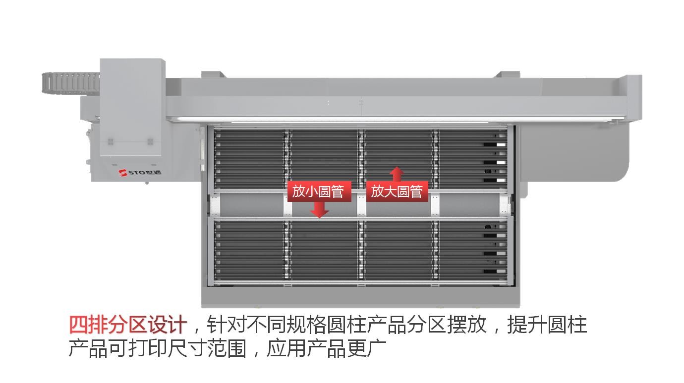 四排分區(qū)設(shè)計,針對不同規(guī)格圓柱產(chǎn)品分區(qū)擺放,提升圓柱產(chǎn)品可打印尺寸范圍,應(yīng)用產(chǎn)品更廣。